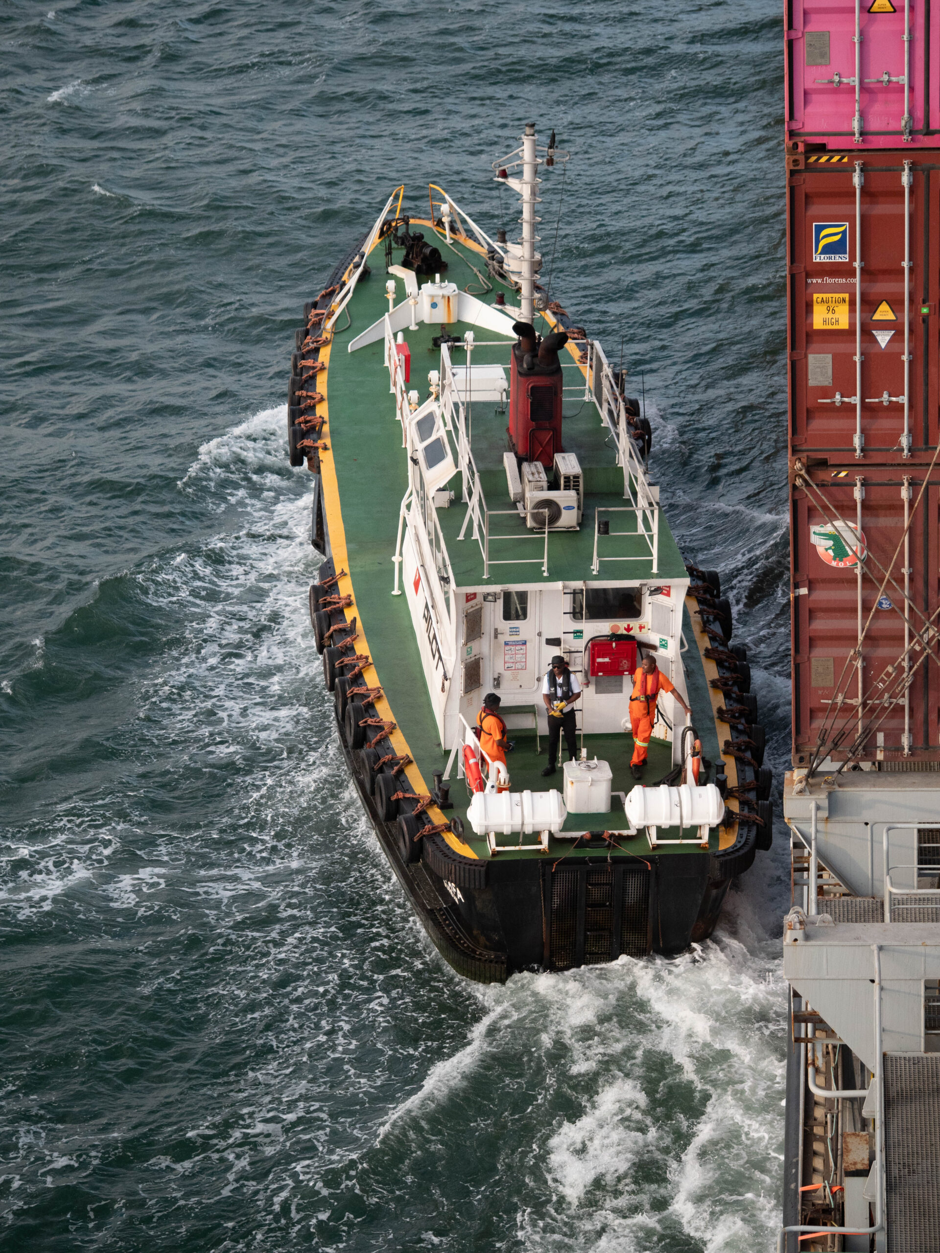 Det var intressant att följa lotsens dirigerande av båten. Han gav order till styrman ”midship”, ”port turn” osv och styrman ställde rodret efter kommandot. Lotsningen var en väldigt snabb procedur, det tog bara några minuter att komma igång efter att lotsen kommit ombord och lika snabbt tog det slut när vi gick ut mot havet.