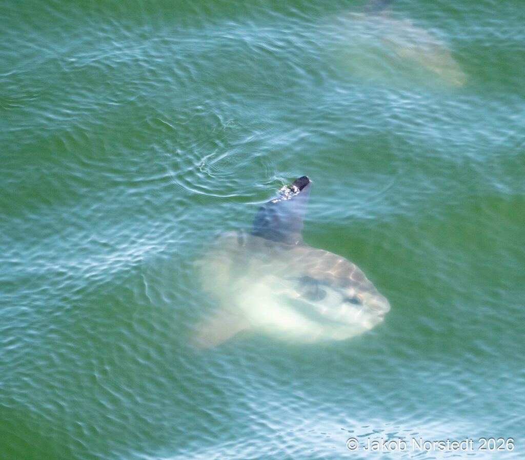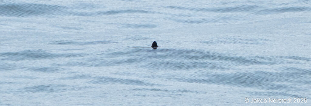 Nyss såg jag något karakteristiskt sticka upp, ryggfenan på en haj. När vi kom närmare fick jag ett riktigt närporträtt av hajen, med en kompis strax ovanför. Jag tog bilderna från kommandobryggan.