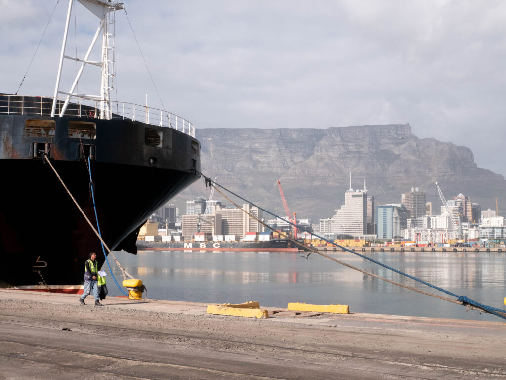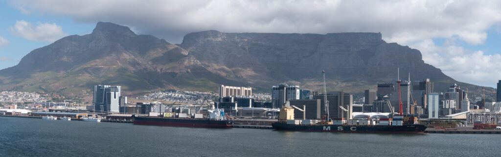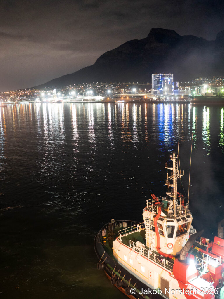 Vi närmade oss Kapstaden vid lunch på söndagen men fick ligga och vänta. Först vid kl 2 på natten gick vi in mot hamnen. Jag vaknade av att ljud och vågrörelser förändrades och gick ut och kikade.